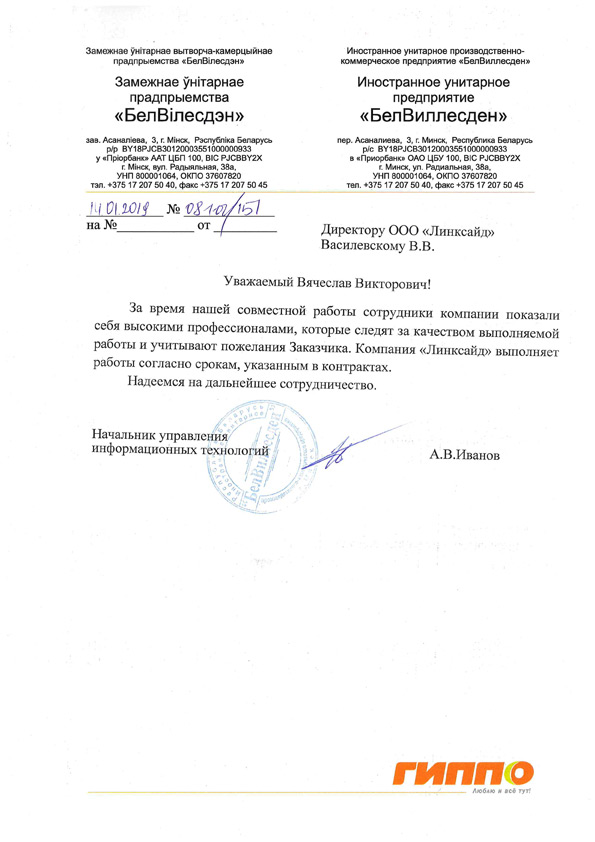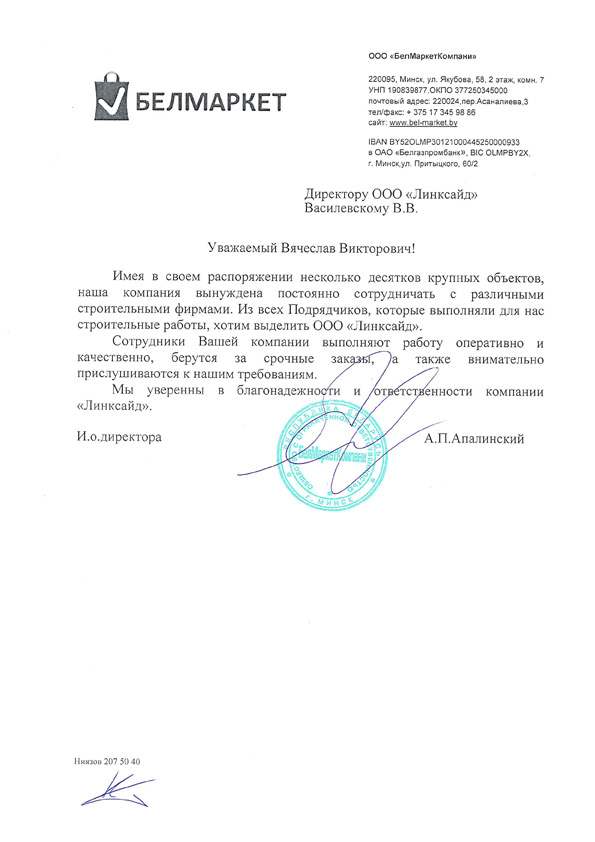 16.04.2021 Настоящим письмом ООО "БелМаркетКомпани" выражает признательность ООО "Линксайд" за работы по проектированию и монтажу структурированных кабельных систем (СКС), выполненные на торговых объектах сети "Белмаркет". При проведении работ ООО "Линксайд" показало себя как надежный партнер. Монтаж СКС производился с соблюдением всех стандартов и в строгом соответствии с нашими техническими заданиями. На всех этапах реализации проектов поставленные задачи выполнялись сотрудниками Вашей компании добросовестно, качественно и всегда в установленные сроки. ООО "БелМаркетКомпани" положительно оценивает взаимодействие с ООО "Линксайд" и надеется в будущем продолжать успешное развитие сотрудничества. |