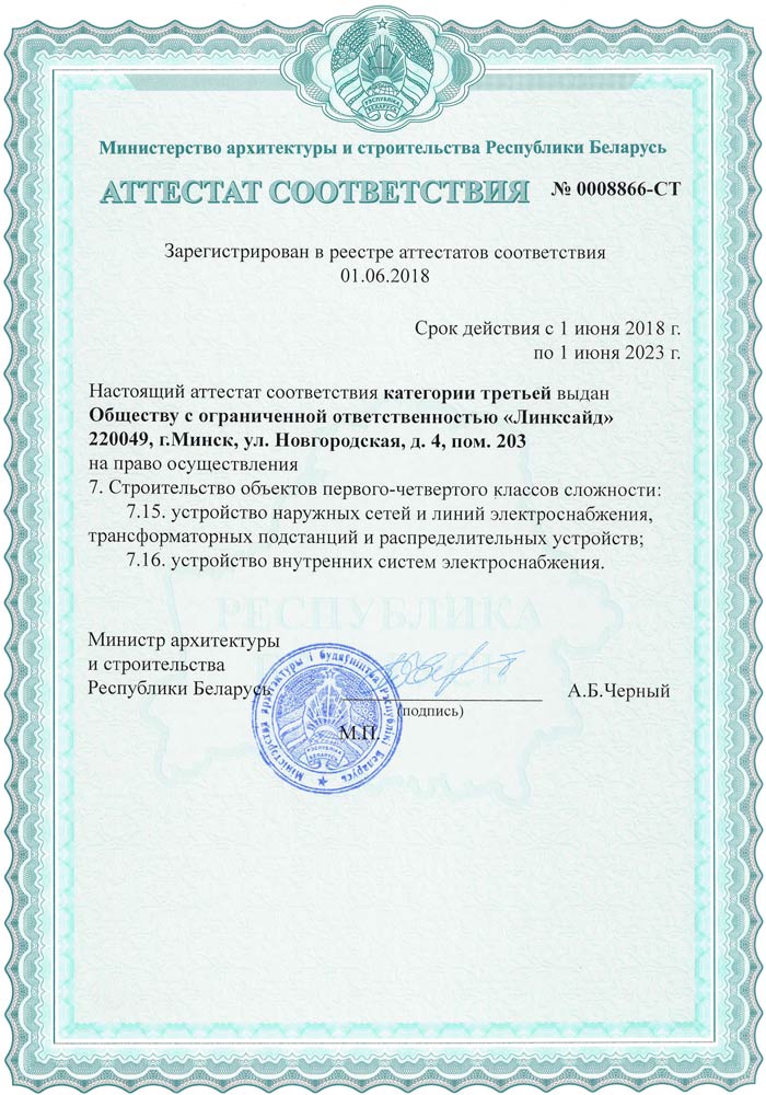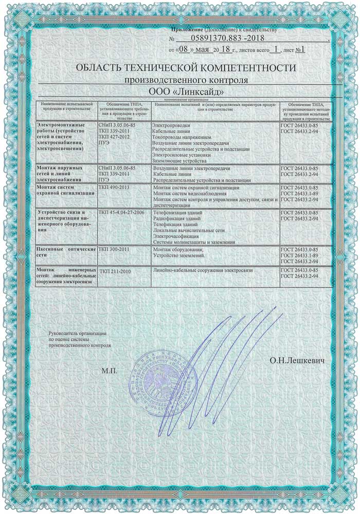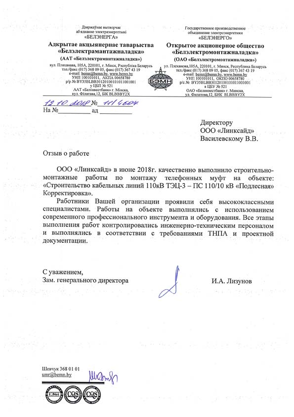 ООО "Линксайд" в июне 2018 г. качественно выполнило строительно-монтажные работы по монтажу телефонных муфт на объекте: "Строительство кабельных линий 110 кВ ТЭЦ-3 - ПС 110/10 кВ "Подлесная" Корректировка". Работники Вашей организации проявили себя высококлассными специалистами. Работы на объекте выполнялись с использованием современного профессионального инструмента и оборудования. Все этапы выполнения работ контролировались инженерно-техническим персоналом и выполнялись в соответствии с требованиями ТНПА и проектной документации. |