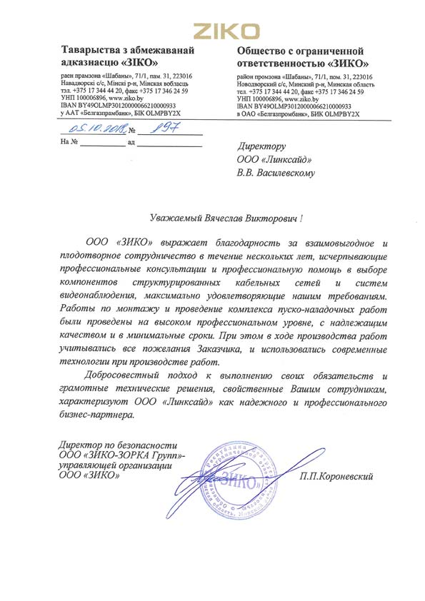 ООО "ЗИКО" выражает благодарность за взаимовыгодное и плодотворнрое сотрудничество в течение нескольких лет, исчерпывающие профессиональные консультации и профессиональную помощь в выборе компонентов структурированных кабельных сетей и систем видеонаблюдения, максимально удовлетворяющие нашим требованиям. Работы по монтажу и проведение комплекса пуско-наладочных работ были проведены на высоком профессиональном уровне, с надлежащим качеством и в минимальные сроки. При этом в ходе производства работ учитывались все пожелания Заказчика, и использовались современные технологии при производстве работ. Добросовестный подход к выполнению своих обязательств и грамотные технические решения, свойственные Вашим сотрудникам, характеризуют ООО "Линксайд" как надежного и профессионального бизнес-партнера. |